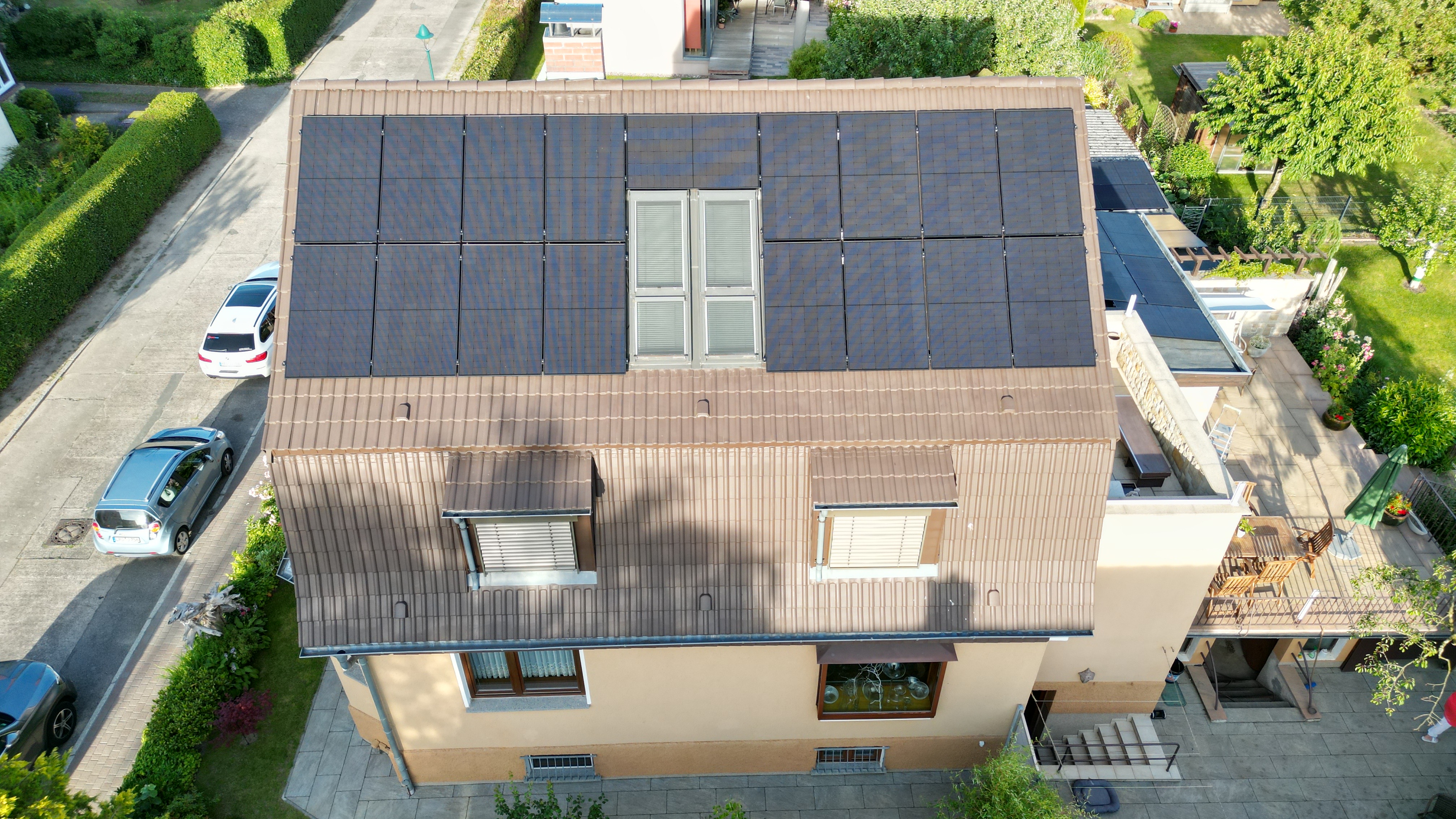 Das Dach mit der inzwischen installierten Photovoltaikanlage — ein stabiles, sauberes Gesamtbild